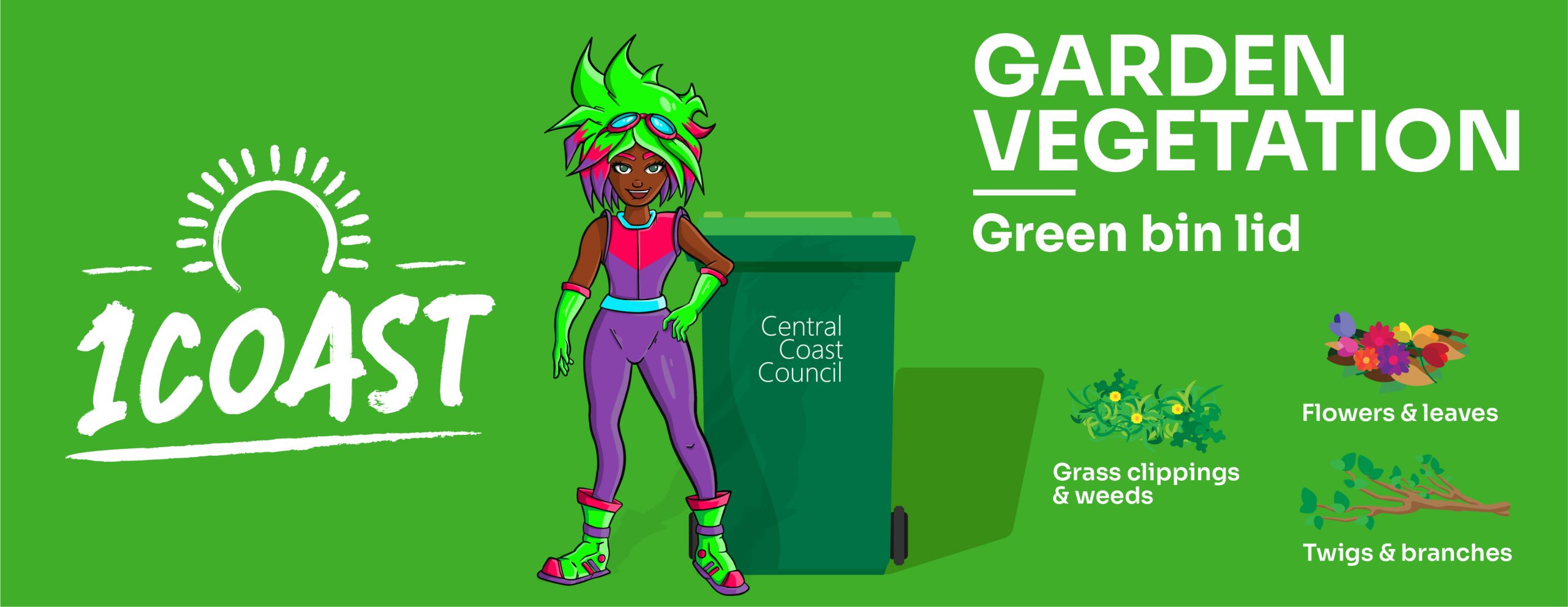 Garden vegetation bins are available for all properties east of the Sydney to Newcast M1 Pacific Motorway. This makes recycling garden waste easier than ever on the Central Coast. Recycling garden vegetation has real benefits for the environment, the most obvious being the landfill space saved. Your green lid bin is for garden vegetation only. This bin is collected fortnightly on the same day as your red-lidded garbage bin, but on the alternate weeks to your recycling bin. Visit our Bin Collection Day page to find out what day your bins are emptied. The following can be placed in your green lid garden bin: The following can be placed in your green lid garden bin Grass clippings and leaves Flowers and weeds Prunings, twigs and branches Untreated timber Plants and small shrubs Items not accepted in your green lid garden vegetation bin: Items not accepted in your green lid garden vegetation bin Rocks and soil Food scraps Garden hoses Pots Treated timber and lattice Large branches, logs and stumps Plastic bags Biodegradable bags Pet waste including kitty litter Building materials If you put the wrong items into your garden vegetation bin, it may not be collected. Garden Vegetation Tips No plastic bags: Simply put your vegetation items loosely into the bin. Staff at the composting facility will not open plastic bags, so anything in a plastic bag will end up in landfill. Composting right: Make sure branches, pruning and twigs including palm fronds are cut to a length that enables the lid of the bin to close. What happens to your garden vegetation? Each fortnight Cleanaway empties your garden vegetation bin and delivers the material to a commercial composting facility. A number of products are produced at the facilities, including mulches, organic fertilisers, landscape soils, potting mixes and top dressing, which are sold to various landscaping industries.
