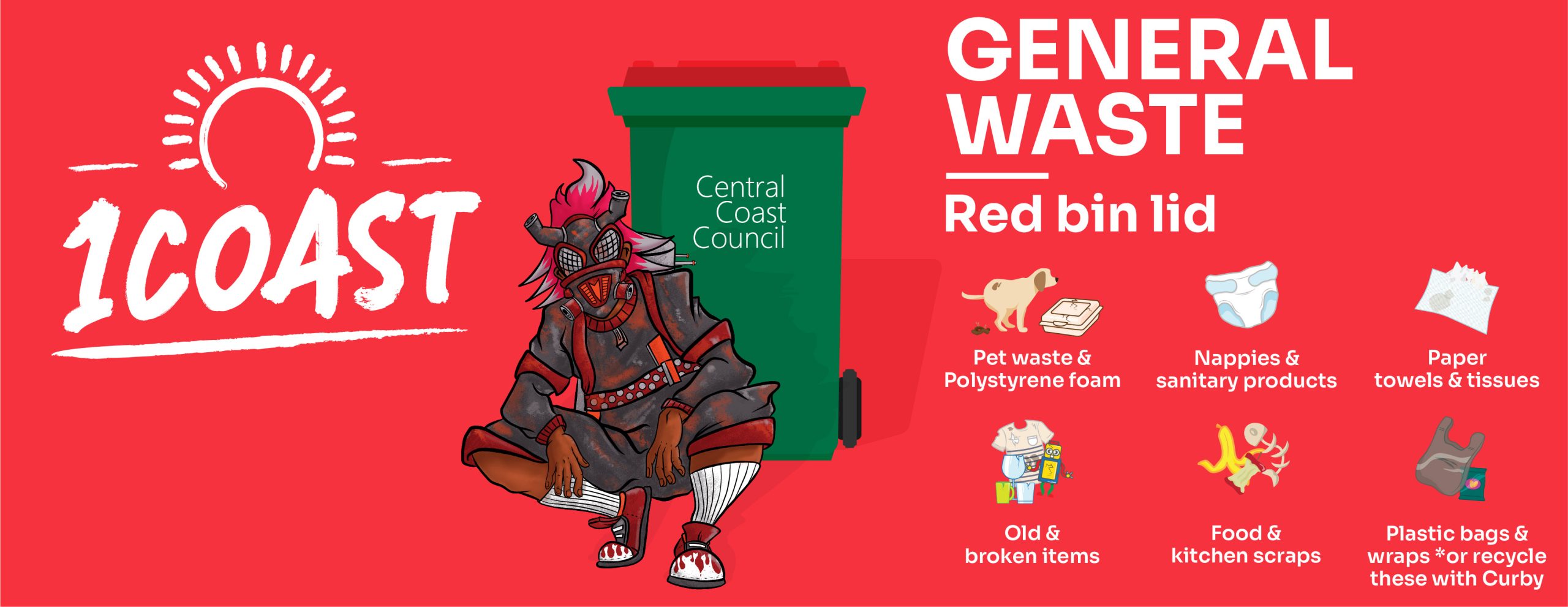 The general waste bin is for most of the items that cannot be placed in your recycling and garden vegetation bins. Your red lid bin is for general waste only. This bin is collected weekly. The following can be placed in your red lid general waste bin: The following can be placed in your red lid general waste bin Food scraps Plastic bags Plastic wrappers Disposable nappies Polystyrene and Styrofoam Light globes and Pyrex Other mixed garbage Items not accepted in your red lid general waste bin: Items not accepted in your red lid general waste bin Car batteries Fire extinguishers Gas bottles Hazardous materials Liquid waste Chemicals Paints and oils Medical waste Building materials If you put the wrong items into your general waste bin, it may not be collected. COVID-19: Safe Waste Disposal Procedures Any individuals asked to self-isolate, either as a precaution or because they are confirmed to have Coronavirus (COVID-19), should observe the following advice to dispose of their household waste to ensure the virus is not spread via personal waste: • Individuals should place all personal waste such as used tissues, gloves, paper towels, wipes, and masks securely in a plastic bag or bin liner;• Bag should be filled no fuller than 80% so that it can be tied securely without spillage;• This plastic bag should then be placed in another plastic bag and securely tied;• These bags must be disposed of in your red lidded garbage bin. General Waste Tips Try the following tips to ensure an odour free bin: Use bin liners to contain your rubbish before placing it in the general waste bin and make sure you tie them up Freeze waste foods such as meat, fish and prawn shells. Place them in the bin the night before collection. This will help slow down the bacteria that break food down causing it to smell Try using deodorised biodegradable nappy bags for the effective disposal of nappies Ensure your bin is not overfilled and the lid is properly closed If possible, keep your bin in a cool shady place and under cover when raining What happens to your general waste? On a weekly basis, general waste bins are collected by Cleanaway and taken directly to the landfill sites at Buttonderry Waste Management Facility and Woy Woy Waste Management Facility. Here, the rubbish is tipped onto the site and managed through the landfill operations. The items that are taken to the landfill will stay there forever, there is no further sorting of these items.